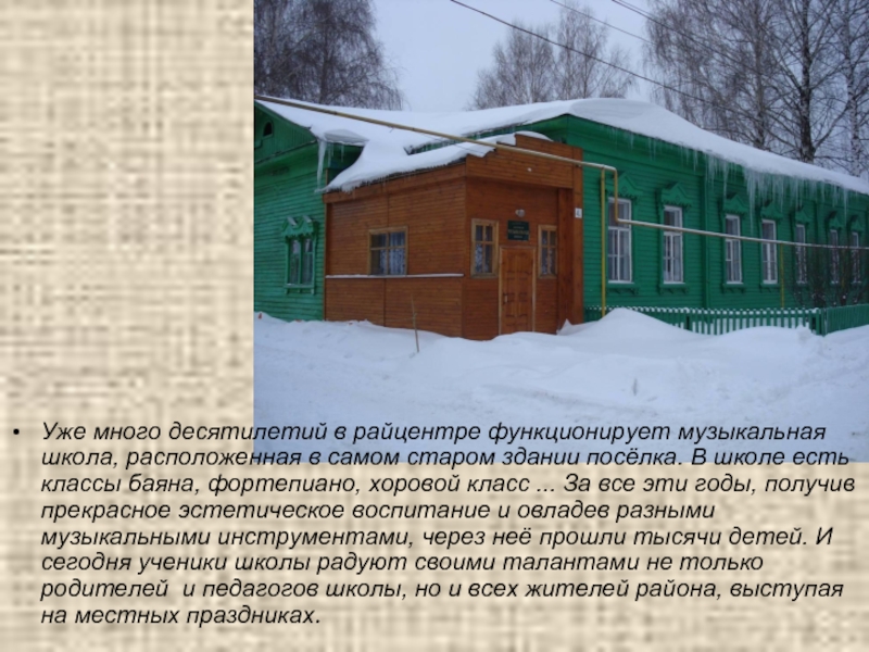 Слайд 13Уже много десятилетий в райцентре функционирует музыкальная школа, расположенная в самом