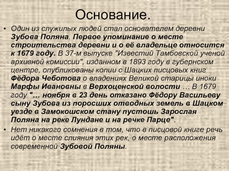 о месте строительства деревни и о её владельце относится к 1679 году. В 37-м выпуске "Известий Тамбовской ученой архивной комиссии", изданном в 1893 году в губернском центре, опубликованы копии с Шацких писцовых книг Фёдора Чеботова о владениях Великой старицы иноки Марфы Ивановны в Верхоценской волости … В 1679 году "… ноября в 23 день отказано Фёдору Васильеву сыну Зубова из поросших отводных земель в Шацком уезде в Замокошском стану пустошь Зарослая Поляна на реке Лундане и на речке Парце".