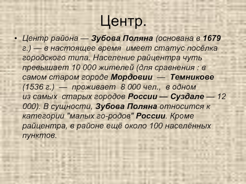 настоящее время  имеет статус посёлка городского типа. Население райцентра чуть превышает 10 000 жителей (для сравнения : в самом старом городе Мордовии  —  Темникове (1536 г.)  —  проживает  8 000 чел.,  в одном из самых  старых городов России — Суздале — 12 000). В сущности, Зубова Поляна относится к категории "малых го-родов" России. Кроме райцентра, в районе ещё около 100 населённых пунктов.