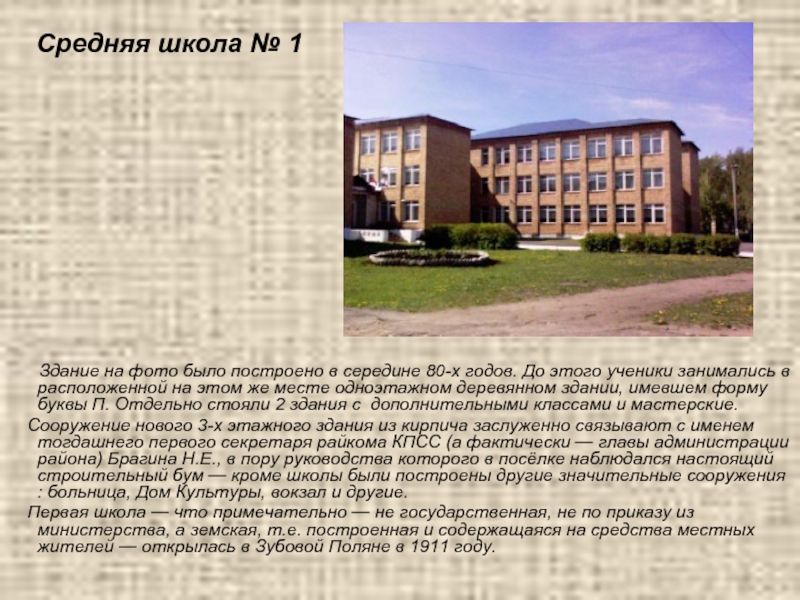 Сооружение нового 3-х этажного здания из кирпича заслуженно связывают с именем тогдашнего первого секретаря райкома КПСС (а фактически — главы администрации района) Брагина Н.Е., в пору руководства которого в посёлке наблюдался настоящий строительный бум — кроме школы были построены другие значительные сооружения : больница, Дом Культуры, вокзал и другие.