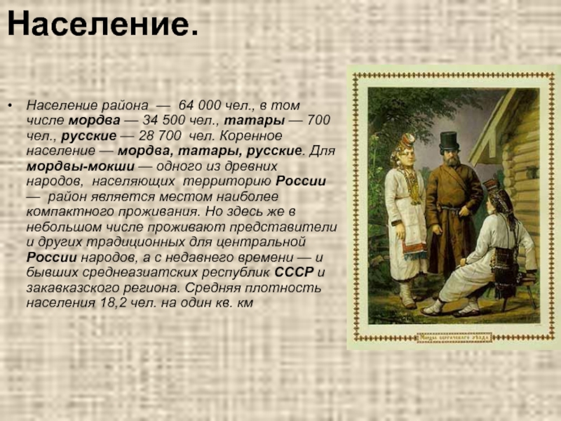 34 500 чел., татары — 700 чел., русские — 28 700  чел. Коренное население — мордва, татары, русские. Для мордвы-мокши — одного из древних  народов,  населяющих  территорию России  —  район является местом наиболее компактного проживания. Но здесь же в небольшом числе проживают представители и других традиционных для центральной России народов, а с недавнего времени — и бывших среднеазиатских республик СССР и закавказского региона. Средняя плотность населения 18,2 чел. на один кв. км