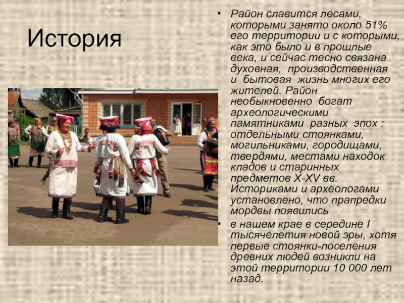 которыми, как это было и в прошлые века, и сейчас тесно связана  духовная,  производственная  и  бытовая  жизнь многих его жителей. Район  необыкновенно  богат  археологическими  памятниками  разных  эпох : отдельными стоянками, могильниками, городищами, твердями, местами находок кладов и старинных предметов X-XV вв. Историками и археологами установлено, что прапредки мордвы появились