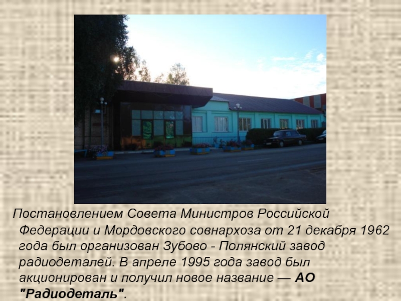 Слайд 10 Постановлением Совета Министров Российской Федерации и Мордовского совнархоза от 21