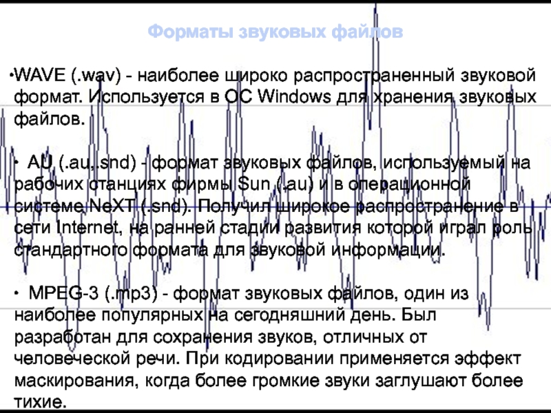 WAVE (.wav) - наиболее широко распространенный звуковой формат. Используется
