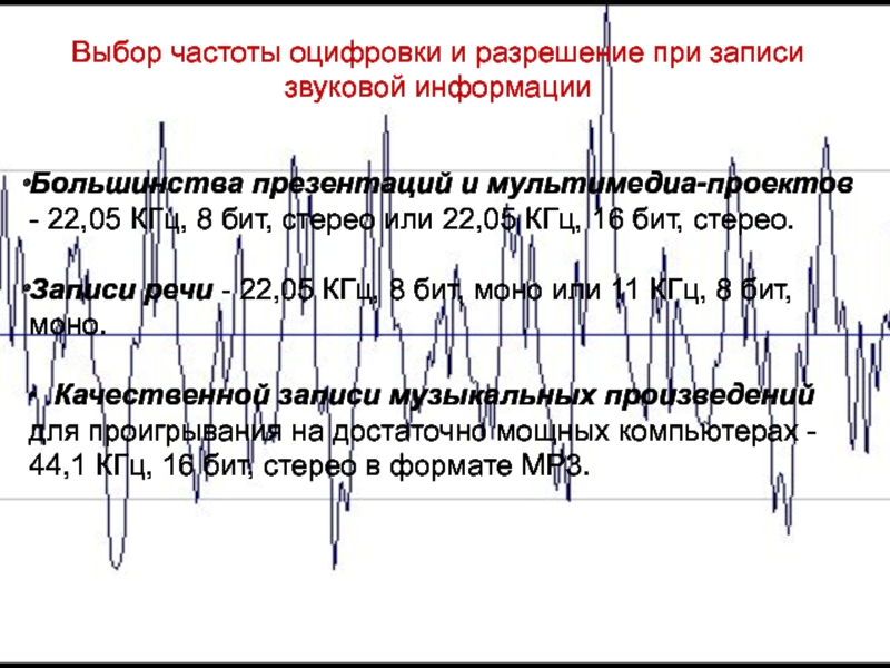 Слайд 11Выбор частоты оцифровки и разрешение при записи звуковой информации