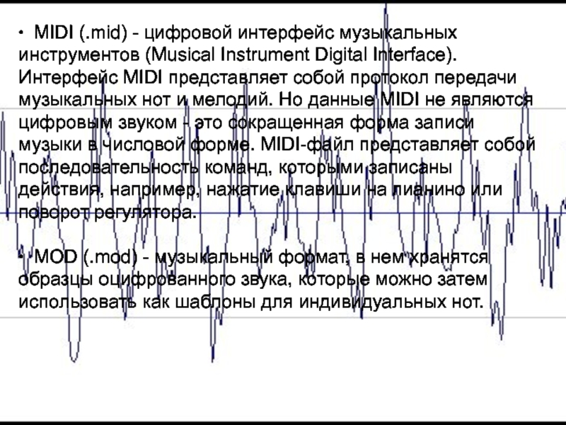 Слайд 5∙ MIDI (.mid) - цифровой интерфейс музыкальных инструментов (Musical Instrument Digital
