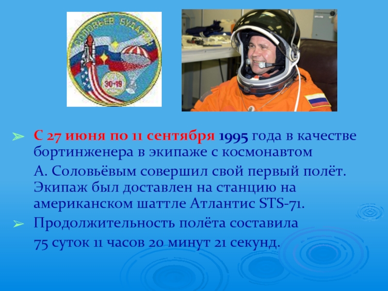 Слайд 25С 27 июня по 11 сентября 1995 года в качестве бортинженера