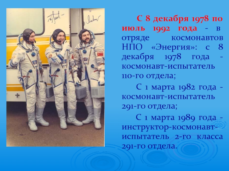 года - в отряде космонавтов НПО «Энергия»: с 8 декабря 1978 года - космонавт-испытатель 110-го отдела;
