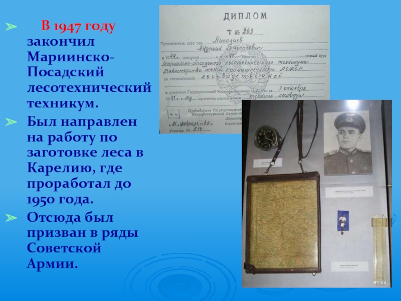 Слайд 7  В 1947 году закончил Мариинско-Посадский лесотехнический техникум.