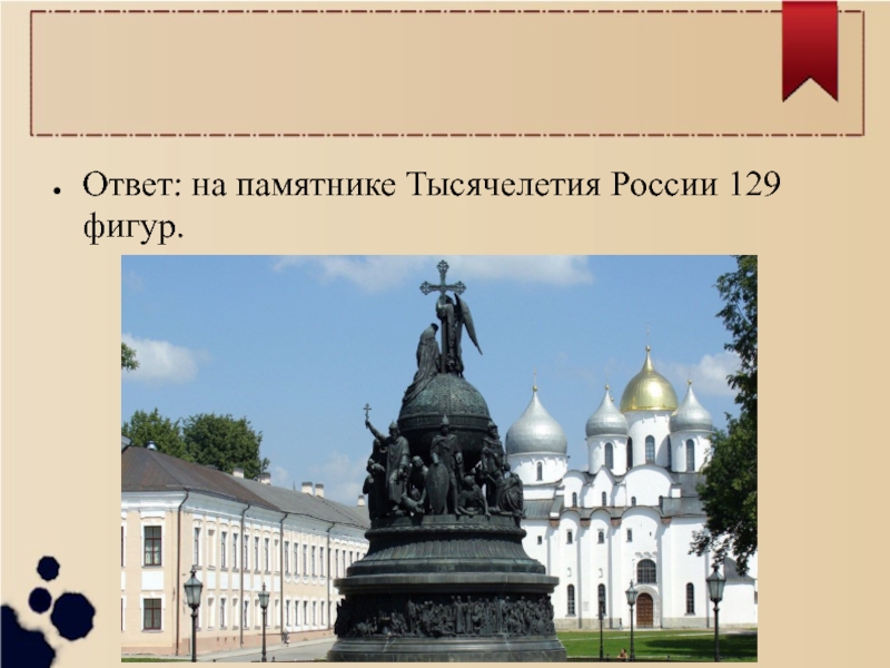 Ответ: на памятнике Тысячелетия России 129 фигур.