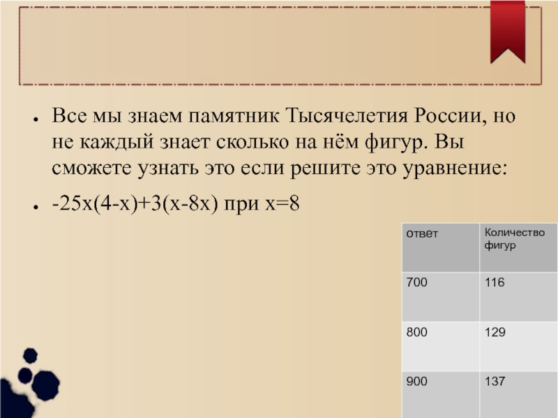 Слайд 1Небольшая задача про фигуры на памятнике Тысячелетия России