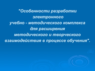 Цель: Раскрыть особенности разработки учебно – методического комплекса. Ожидаемый результат: возможность расширения методического и творческого взаимодействия в процессе обучения. Цель создания УМК: систематизация нормативных, методических, стандарто-реализующих документов; оптимизация подготовки и проведения