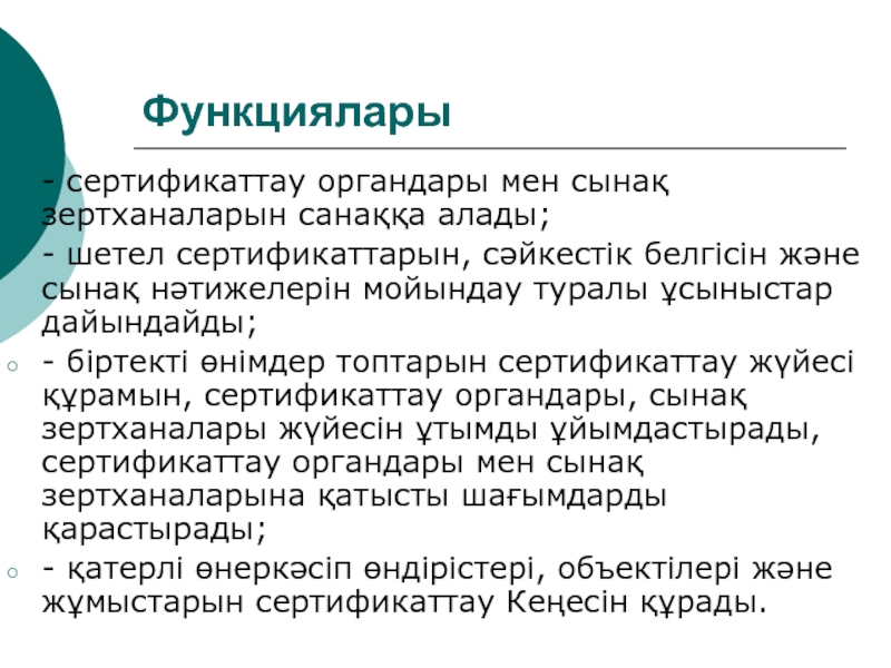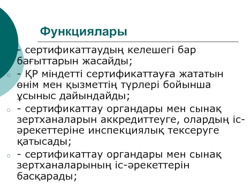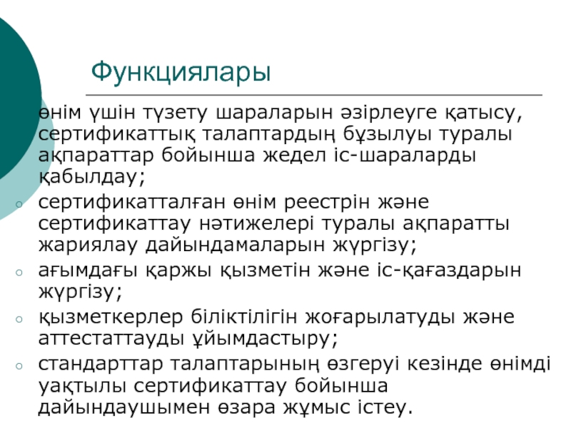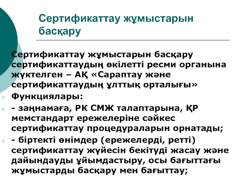 - заңнамаға, РК СМЖ талаптарына, ҚР мемстандарт ережелеріне сәйкес сертификаттау процедураларын орнатады;